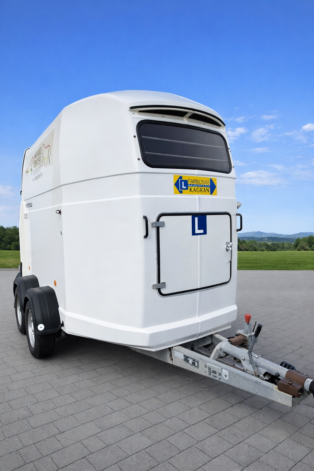 Doppelachs-Pferdeanhänger, Bj. 2001, Auflaufbremse, Rückfahrautomatik, automatisches Stützrad, Sicherheitsfahrgestell mit einzeln aufgehängten Längslenkern, 2.000kg Höchstzulässiges Gesamtgewicht